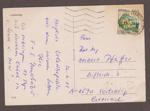 AK Saluti da Lignano. Gelaufen 1989. Großformat. Nummeriert: 419. Zustand: untere Ecken geknickt, Knick rechts neben der Bildmitte, stofffleckig.