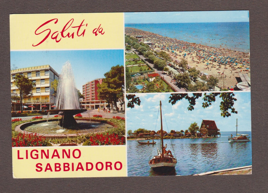 AK Saluti da Lignano Sabbiadoro. Gelaufen. Großformat. Nummeriert: 45. Zustand: mehrere Knicke über der linken Bildhälfte, rechtes unteres Eck geknickt.
