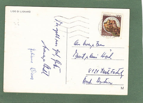 AK Saluti da Lignano Souvenir. Gelaufen. Großformat. Zustand: linkes unteres Eck geknickt, rechtes unteres Eck mehrfach geknickt, sonst leichte Läsuren.