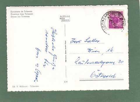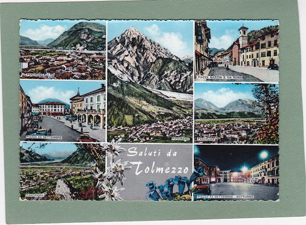 AK Saluti da Tolmezzo. Gelaufen, Stempeldatum schlecht erkennbar. Großformat. Verlag: V. Molinari – Tolmezzo. Nummeriert: 9. Zustand: Ecken leicht angeknickt bzw. leicht angestoßen, Stempelknicke im linken oberen Eck, sonst O.k.