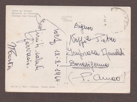 AK Saluti da Tolmezzo. Gelaufen 1964, aber Briefmarke wurde entfernt. Großformat. Verlag: Moro. Nummeriert: C 9. Zustand: Knick über dem linken unteren Bild, sonst Ecken leicht angestoßen.