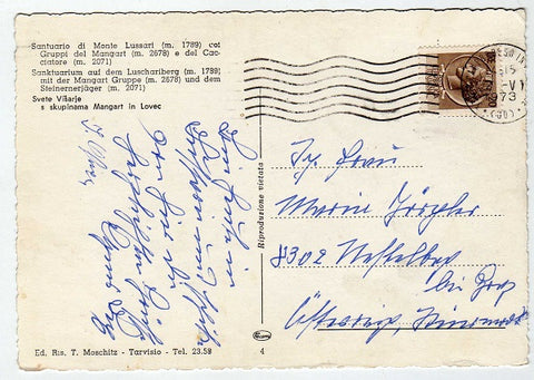 AK Santuario di Monte Lussari coi Gruppi del Mangart e del Cacciatore. Gelaufen 1973. Großformat. Verlag: T. Moschitz Tarvisio. Nummeriert: 4. Zustand: linkes oberes Eck angeknickt, untere Ecken leicht angestoßen, sonst O.k.