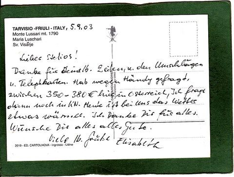 AK Santuario Monte Lussari. Ungelaufen, aber beschrieben. Großformat. Verlag: Cartolnova. Nummeriert: 2019. Zustand: linkes unteres Eck geknickt, sonst O.k.