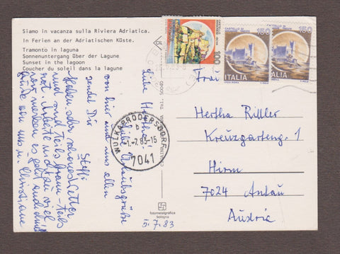 AK Siamo in vacanze sulla Riviera Adriatica. Tramonto in laguna. Lignano ? Gelaufen 1983. Großformat. Verlag: Cigaina. Zustand: obere Ecken angeknickt, rechtes unteres Eck geknickt.