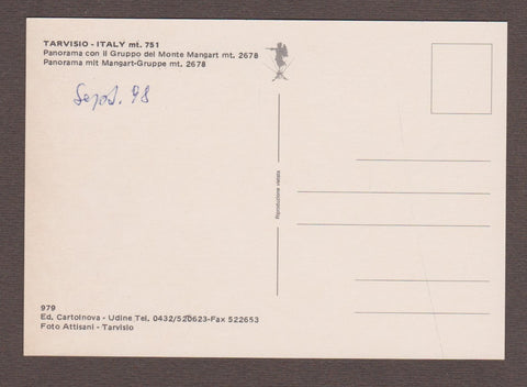 AK Tarvisio. Panorama con il Gruppo del Monte Mangart. Ungelaufen. Großformat. Verlag: Cartolnova. Nummeriert: 979. Zustand: leichter Fingerknick in rechter Bildhälfte.