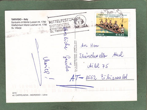 AK Tarvisio. Santuario di Monte Lussari. Gelaufen 2008. Großformat. Verlag: Cartolnova. Nummeriert: 2215. Zustand: rechtes unteres Eck geknickt, sonst leichte Läsuren.
