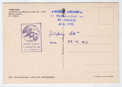 AK Tarvisio. Tramonto sul Monte Lussari. Ungelaufen. Mit zwei Hüttenstempeln, Datum angegeben 22.9.1990. Großformat. Verlag: Cartolnova, Udine. Nummeriert: 507. Zustand: gut, geringe Läsuren.