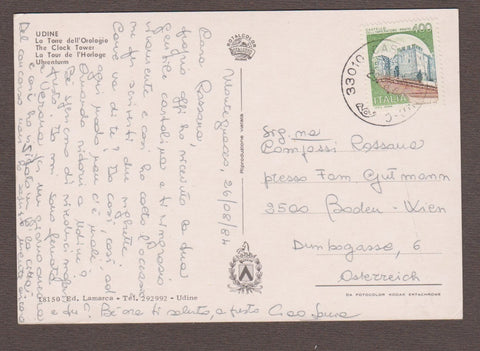 AK Udine. la Torre dell'Orologio. Gelaufen 1984. Großformat. Verlag: Lamarca. Nummeriert: 18150. Zustand: linke Ecken geknickt, sonst leichte Läsuren.