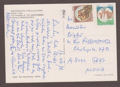 AK Udine. Ristorante Vitello D'Oro. Via Valvason 4. Ungelaufen, aber beschrieben. Großformat. Verlag: Cartolnova. Nummeriert: 1454. Zustand: Knicke über den unteren Ecken.