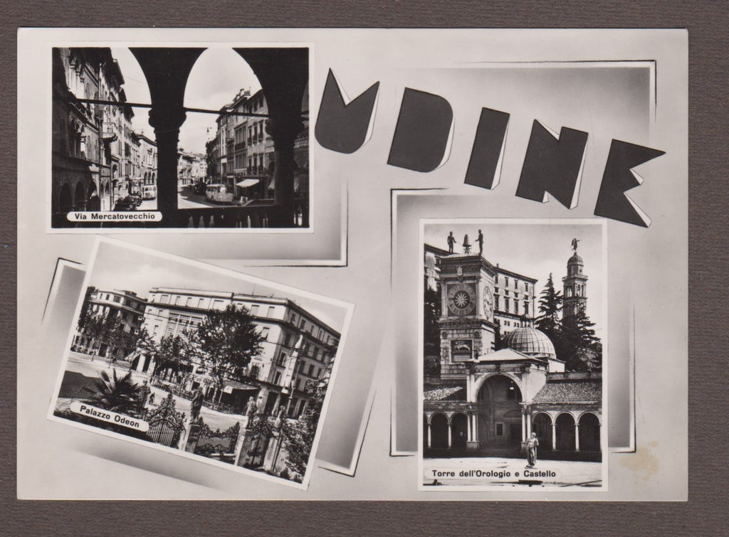 AK Udine. Via Mercatovecchio. Palazzo Odeon. Torre dell'Orologio e Castello. Ungelaufen. Großformat. Verlag: D.T. Zustand: gut.