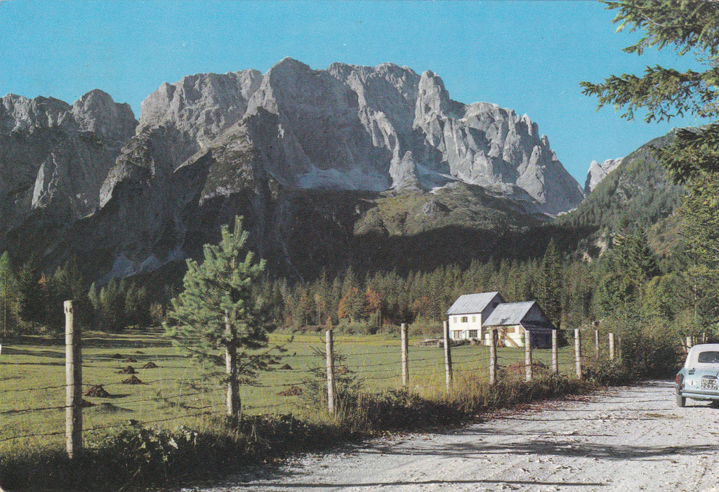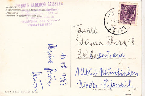 AK Valbruna. Malga Saisera e il Montasio. Gelaufen 1968. Großformat. Verlag: M.T.B.F. Nummeriert: 49. Zustand: rechtes unteres Eck geknickt, Knick am oberen Rand etwas rechts der Mitte, sonst O.k.