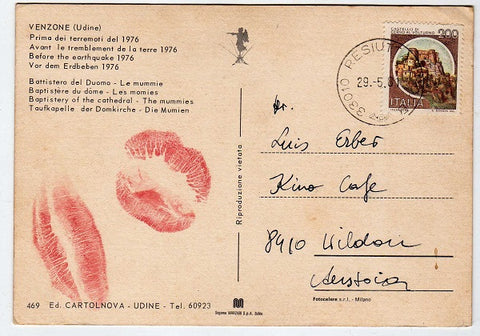 AK Venzone. Battistero del Duomo – Le Mummie. Prima die terremoti del 1976. Gelaufen 1981 in Resiutta. Verlag: Cartolnova Udine. Nummeriert: 469. Zustand: linkes oberes Eck geknickt, Ecken angeknickt bzw. bestoßen, Rand etwas bestoßen.