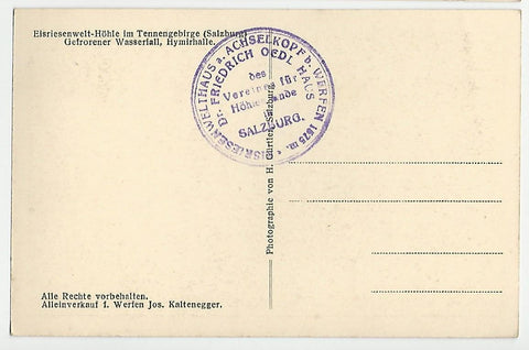 AK Eisriesenwelt-Höhle im Tennengebirge. Gefrorener Wasserfall, Hymirhalle. Ungelaufen. Kleinformat. Verlag: Gürtler. Zustand: gut.