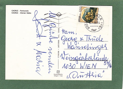 AK Caorle – Porticciolo. Gelaufen 1988 in Caorle. Großformat. Verlag: Cigaina Latisana. Zustand: obere Ecken geknickt, linkes unteres Eck angeknickt, sonst O.k.