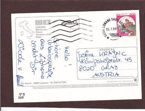 AK Lignano. Gelaufen 1998. Großformat. Verlag: Guerin. Zustand: linkes oberes Eck geknickt, Knick am unteren Rand in der rechten Hälfte.
