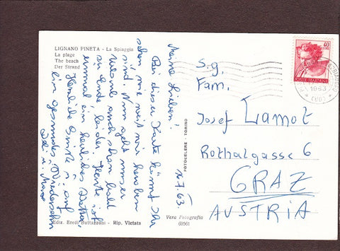 AK Lignano Pineta – La Spiaggia. Gelaufen 1963. Großformat. Verlag: Buttazzoni. Nummeriert: 69561. Zustand: gut, kleines Kugelschreiberkreuzerl in rechter oberer Hälfte.