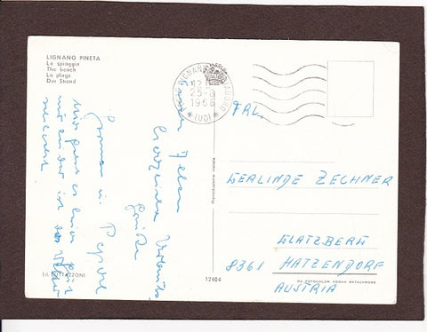 AK Lignano Pineta. La spiaggia. Gelaufen 1966, aber Briefmarke wurde entfernt. Großformat. Verlag: Buttazzoni. Nummeriert: 12404. Zustand: linkes oberes Eck angeknickt, andere Ecken wenig angestoßen.