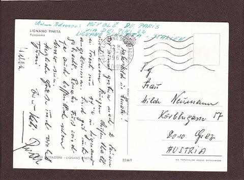 AK Lignano Pineta. Panorama. Gelaufen 1967, aber Briefmarke wurde entfernt. Großformat. Verlag: Buttazzoni. Nummeriert: 22469. Zustand: in linker oberen Hälfte bestoßen, gewölbt, wo an der Rückseite die Briefmarke gelöst wurde.