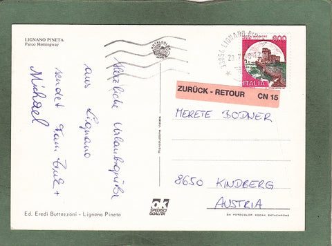 AK Lignano Pineta. Parco Hemingway. Gelaufen 1998 Retour. Großformat. Verlag: Eredi Buttazzoni, Lignano Pineta. Zustand: vorne aufgeklebt Retourpickerl mit Stempel.