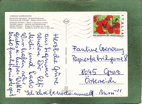 AK Lignano Sabbiadoro. Gelaufen. Großformat. Verlag: Cigaina. Zustand: Ecken angeknickt, Kugelschreiberpfeil.