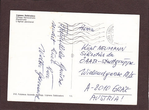 AK Lignano Sabbiadoro. Chiesa Parrocchiale. Gelaufen, aber Briefmarke wurde entfernt. Großformat. Verlag: P.R. Fototeca. Nummeriert: 1/L. Zustand: stärker bestoßen.