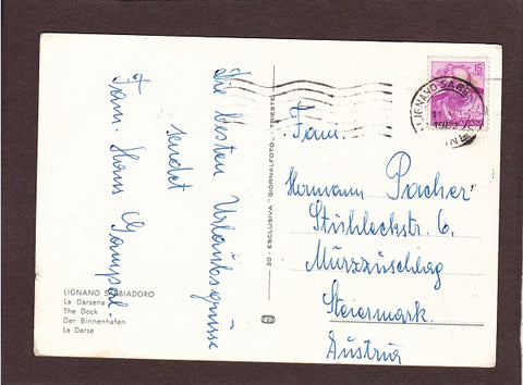 AK Lignano Sabbiadoro. La Darsena. Gelaufen 1962. Großformat. Verlag: Giornalfoto. Nummeriert: 20. Zustand: Knick über dem rechten oberen Eck, am rechten Rand unten etwas bestoßen mit kleinem Einriss, Knick im linken oberen Eck, Einriss am linken Rand oben ca. 8mm.