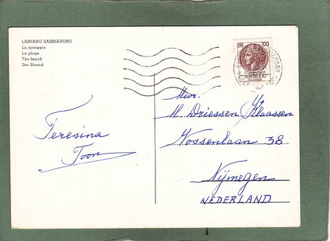 AK Lignano Sabbiadoro. La spiaggia. Gelaufen 1976. Großformat. Zustand: rechtes unteres Eck geknickt, sonst leichte Randläsuren.