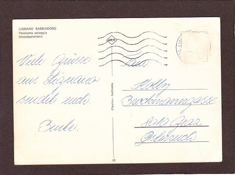 AK Lignano Sabbiadoro. Panorama spiaggia. Gelaufen, aber Briefmarke wurde entfernt. Großformat. Verlag: Cigaina. Nummeriert: 10. Zustand: linkes oberes Eck geknickt, Ecken angestoßen.