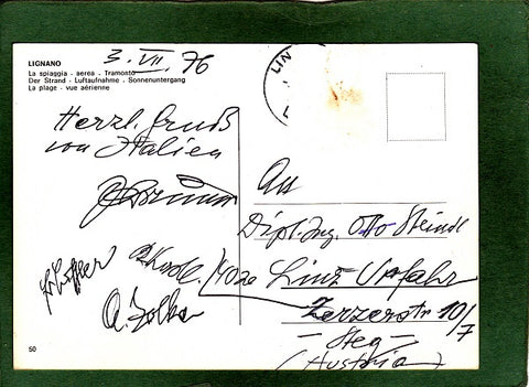 AK Lignano Souvenir. Gelaufen 1976, aber Briefmarke wurde entfernt. Großformat. Nummeriert: 50. Zustand: stärker bestoßen.