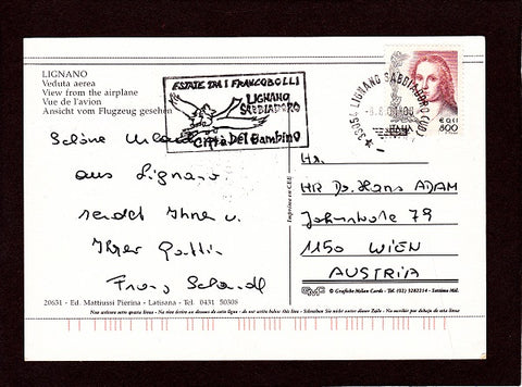 AK Lignano. Veduta aerea. Gelaufen 2001. Großformat. Verlag: Matiussi. Nummeriert: 20631. Zustand: gut, linkes unteres Eck geknickt.