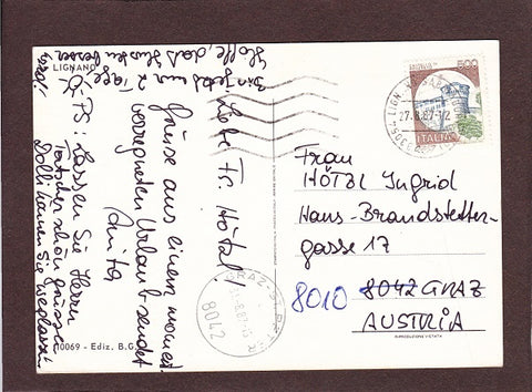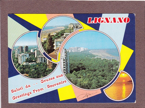 AK Saluti da Lignano. Gelaufen 1987. Großformat. Verlag: B.G. Nummeriert: 10069. Zustand: rechte Ecken angeknickt, sonst O.k.