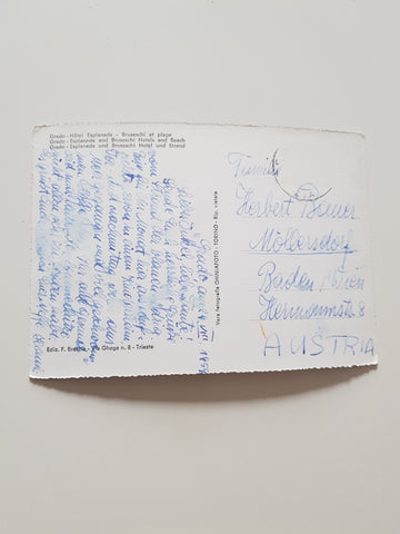 AK Grado Spiaggia con Hotels Esplanade e Bruseschi. Gelaufen, aber Briefmarke wurde entfernt. Großformat. Nummeriert: 73. Zustand: gut.