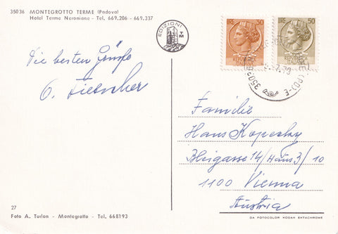 AK Montegrotto Terme. Hotel Terme Neroniane. Gelaufen. Großformat. Verlag: Turlon. Nummeriert: 27. Zustand: gut, rechtes unteres Eck geknickt.