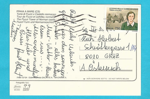 AK Praia a Mare. Torre di Fiuzzi e Castello normanno. Gelaufen. Großformat. Verlag: Galante. Nummeriert: 73/104. Zustand: gut.