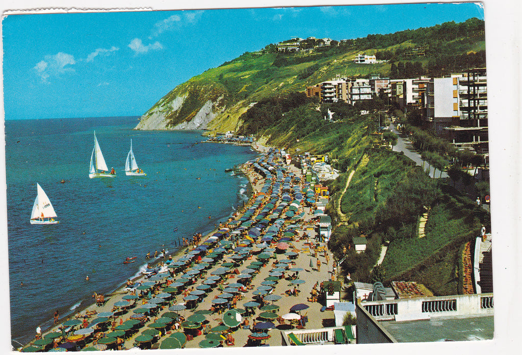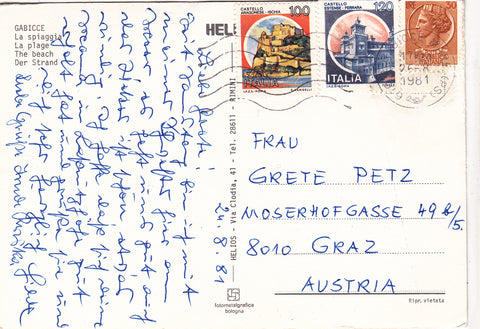 AK Gabicce. La spiaggia. Gelaufen 1981. Großformat. Verlag: Helios. Zustand: rechtes oberes und linkes unteres Eck geknickt.