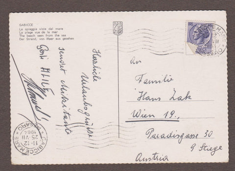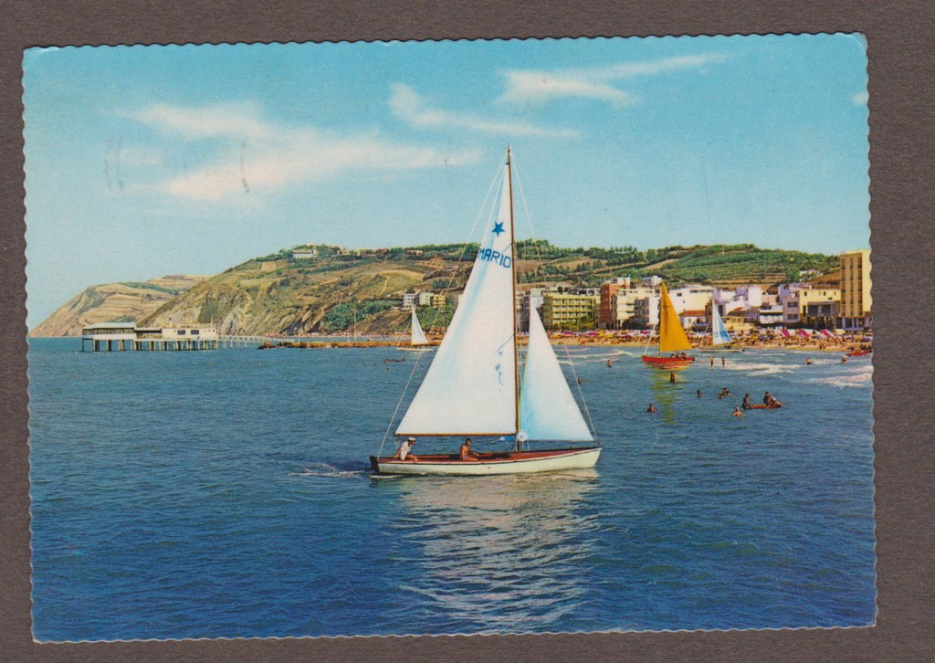 AK Gabicce. La spiaggia vista dal mare. Gelaufen 1964. Großformat. Verlag: MAB. Nummeriert: 380. Zustand: rechtes oberes Eck geknickt, Fingerknick beim rechten Rand in der unteren Hälfte, sonst Ecken wenig angeknickt.