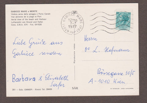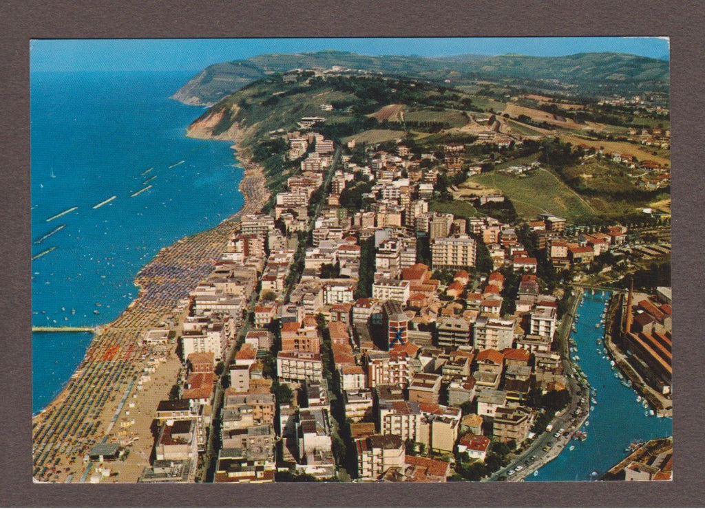 AK Gabicce Mare e Monte. Veduta aerea della spiaggia e Porto Canale. Gelaufen 1977. Großformat. Verlag: EMMEPI. Nummeriert: 261. Zustand: linkes unteres Eck geknickt, Kugelschreiberkreuz unterhalb der Bildmitte.