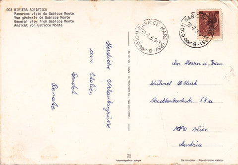 AK Riviera Adriatica. Panorama da Gabicce Monte. Gelaufen. Format: 20 x 14 cm. Verlag: pama. Nummeriert: 003. Zustand: stärker bestoßen.