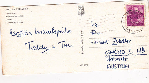 AK Riviera Adriatica. Tramonto. Gelaufen. Extrakleinformat. Verlag: MAB. Nummeriert: MG 392. Zustand: gut, linkes unteres Eck leicht geknickt.