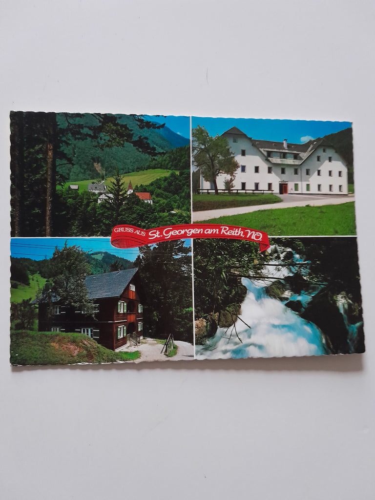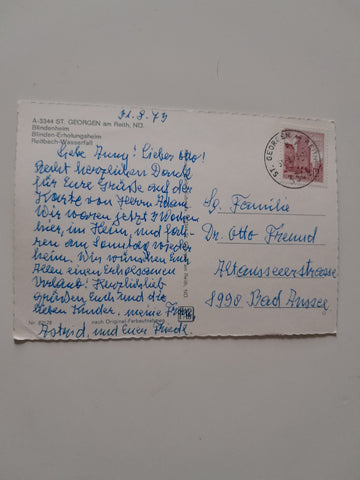 AK St. Georgen am Reith. Blindenheim, Blinden-Erholungsheim. Reitbach-Wasserfall. Gelaufen. Großformat. Verlag: PAG. Nummeriert: 82178. Zustand: gut, rechtes unteres Eck geknickt.