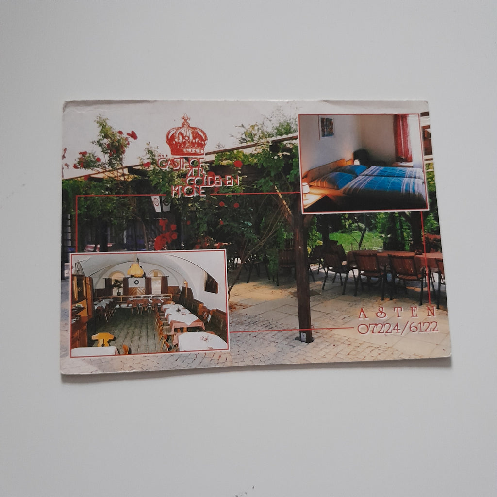AK Asten. Gasthof zur Goldenen Krone. Hermine & Johann Reisinger. Gelaufen. Großformat. Zustand: obere Ecken und am oberen Rand geknickt.