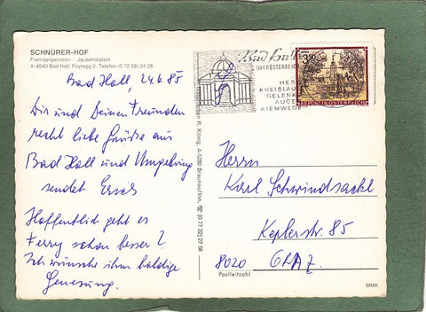 AK Bad Hall. Schnürer-Hof. Gelaufen 1985. Großformat. Verlag: König. Zustand: linkes oberes Eck geknickt, Knick im rechten oberen Eck, sonst O.k.