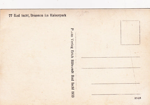 AK Bad Ischl. Brunnen im Kaiserpark. (1933) Ungelaufen. Kleinformat. Verlag: Bährendt. Nummeriert: 77. Zustand: gut, Ecken mit leichten Steckalbumdruckspuren, kleiner Knick am rechten Rand oben.