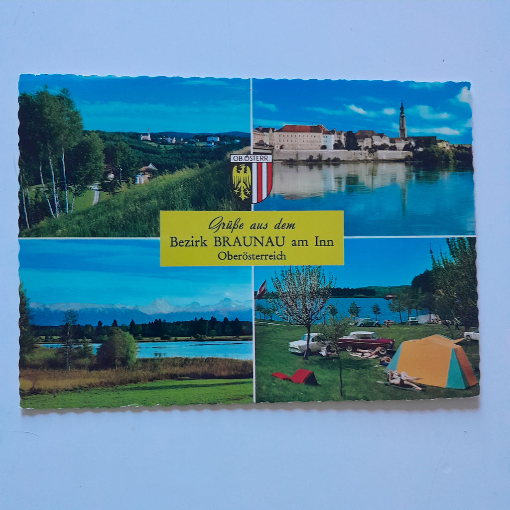 AK Grüße aus dem Bezirk Braunau am Inn. (Kobernaußerwald mit Maria Schmolln, Braunau, Ibmer Moor, Heratinger See, Camping Holzöstersee am Weilhartsforst)