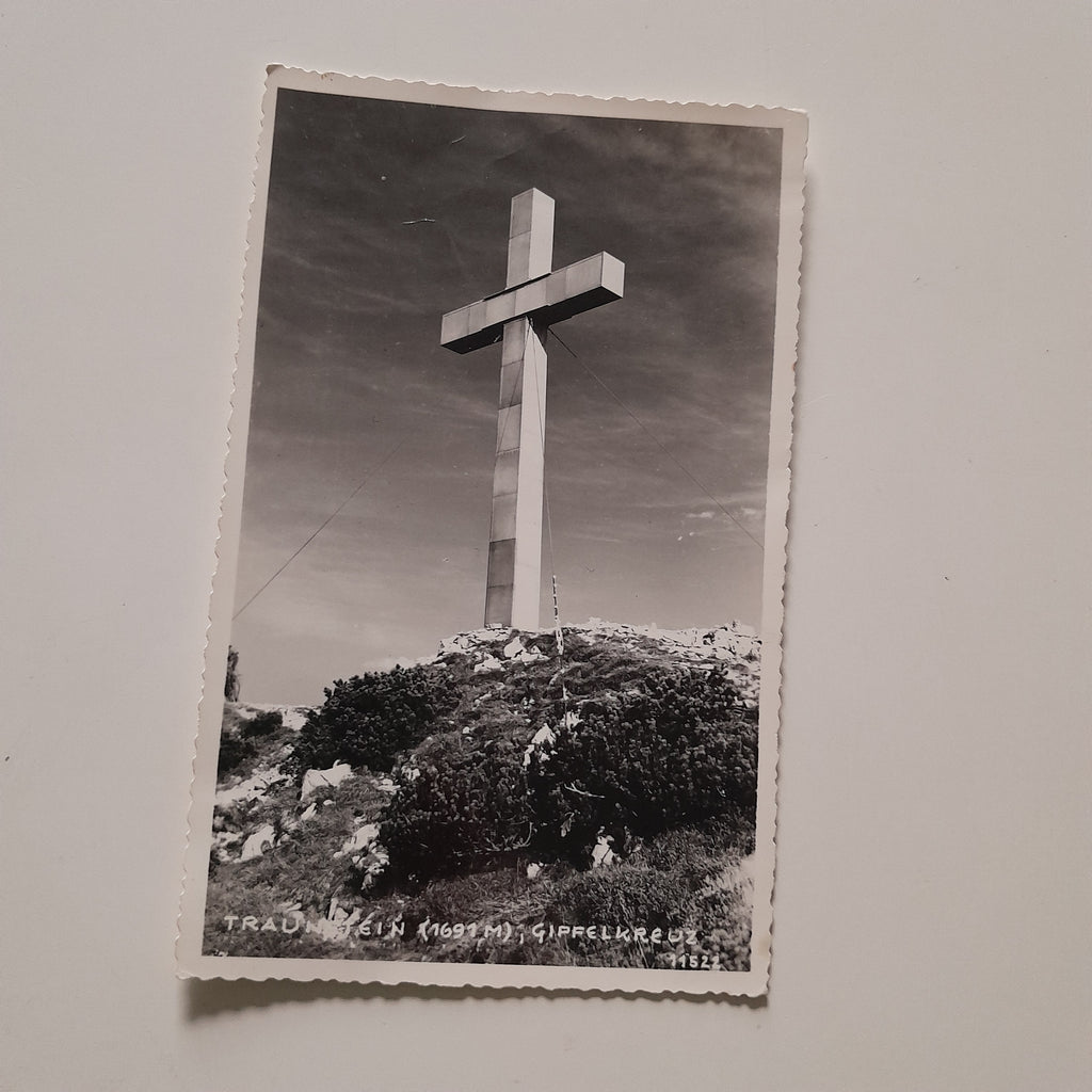 AK Traunstein, Gipfelkreuz. Gelaufen, aber Briefmarke wurde entfernt. Kleinformat. Verlag: Brandt. Nummeriert: 11522. Zustand: stärker bestoßen.
