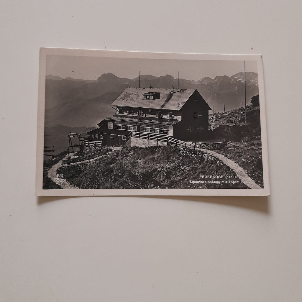 AK Feuerkogel. Alpenvereinshaus mit Totem Gebirge. Gelaufen. Kleinformat. Verlag: Cosy. Nummeriert: 915. Zustand: gut.