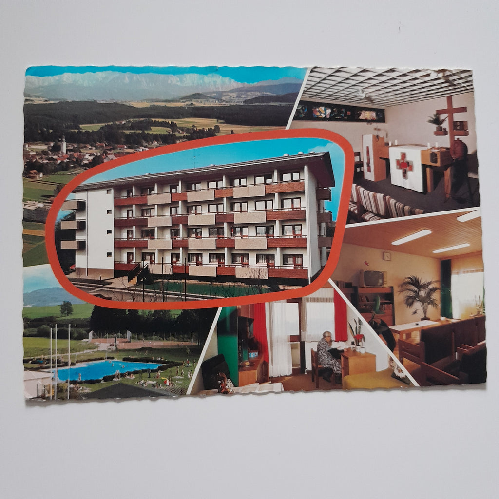 AK Frankenmarkt. Pensionistenheim der Marktgemeinde. Anton Andorfer Weg 4. Gelaufen. Großformat. Verlag: Schachermaier. Nummeriert: 1142. Zustand: gut, rechtes oberes Eck geknickt.