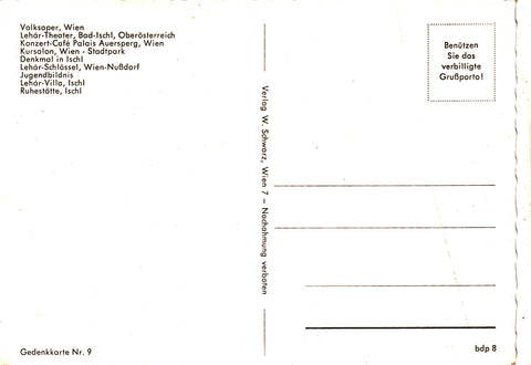 AK Gedenk-Karte Franz Lehar. Wien. Bad Ischl. Ungelaufen. Großformat. Verlag: Schwarz. Nummeriert: 9. Zustand: linkes oberes Eck angeknickt, andere Ecken etwas angestoßen, sonst O.k.