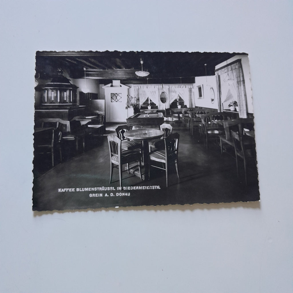 AK Grein an der Donau. Kaffee Blumensträussl im Biedermeierstil. Ungelaufen. Großformat. Zustand: gut.