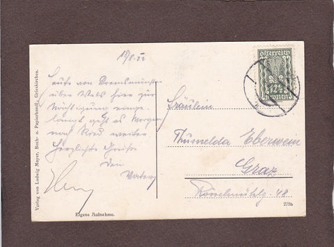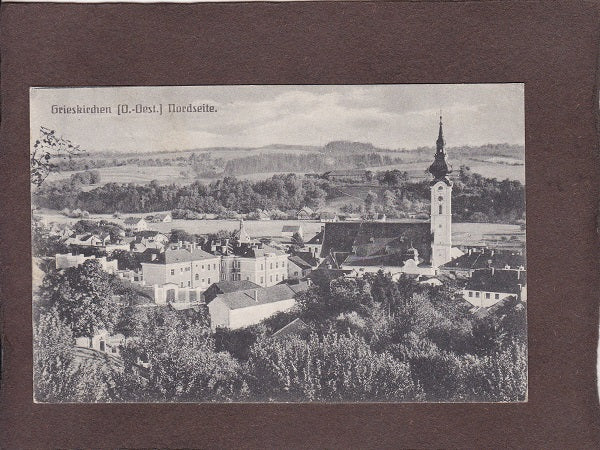 AK Grieskirchen. Nordseite. Gelaufen 1921. Kleinformat. Verlag: Mayer. Zustand: leichter Fingerknick etwas links oberhalb des Kirchturms, sonst O.k.